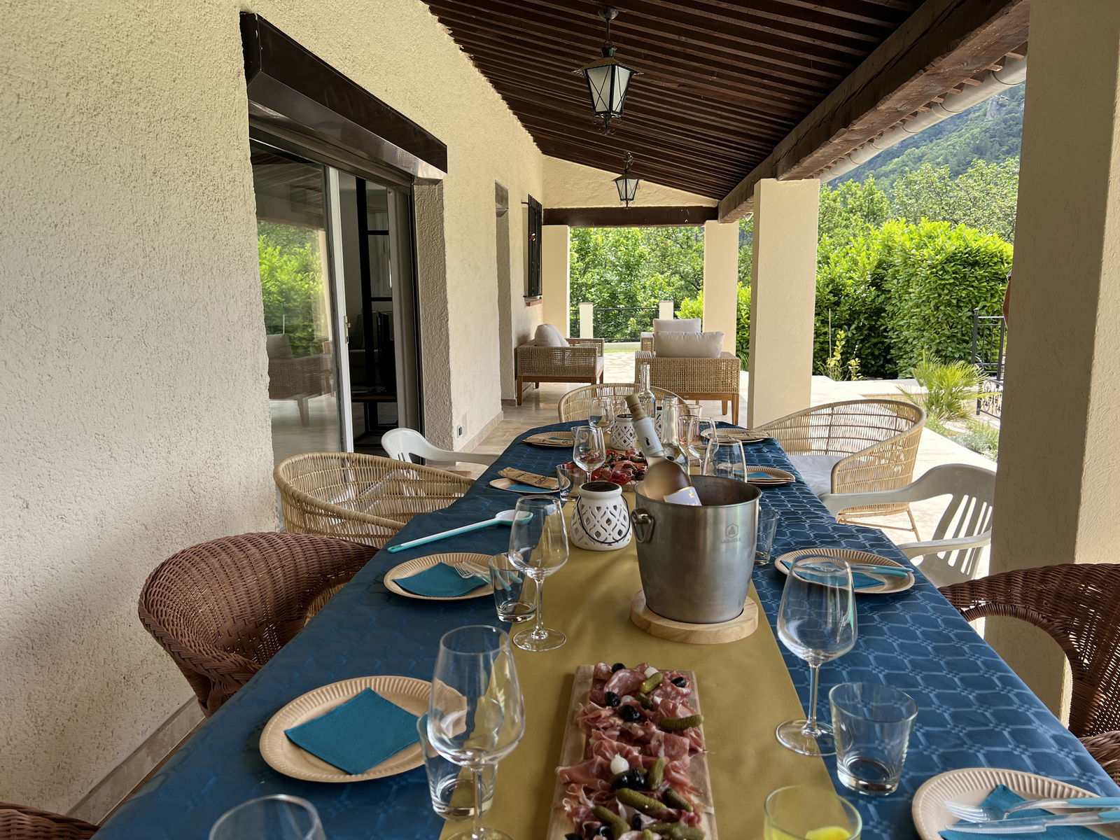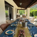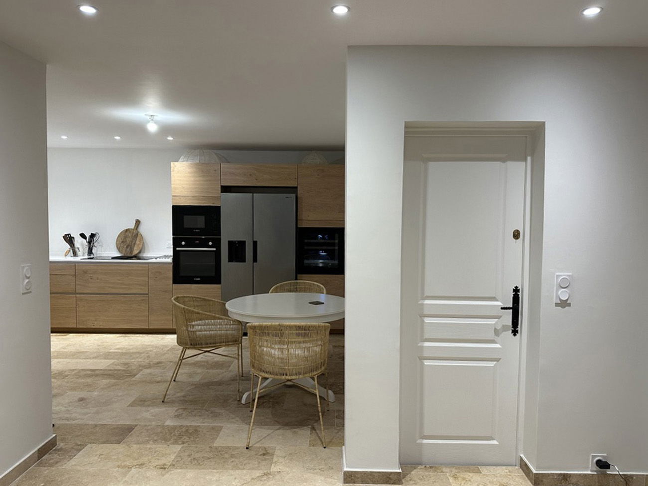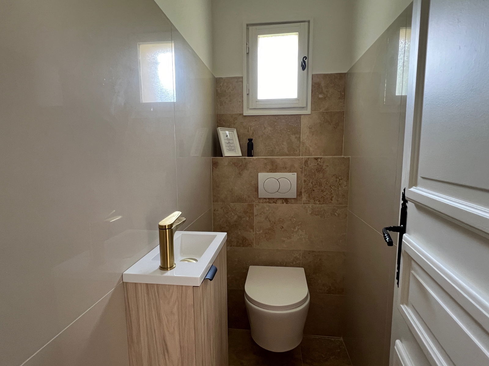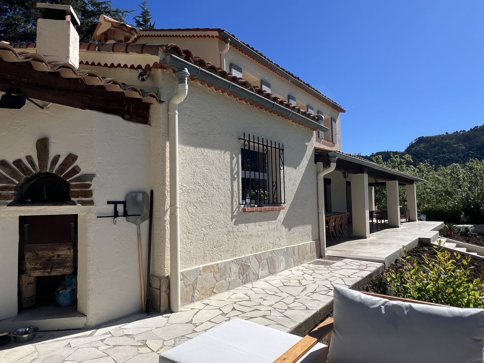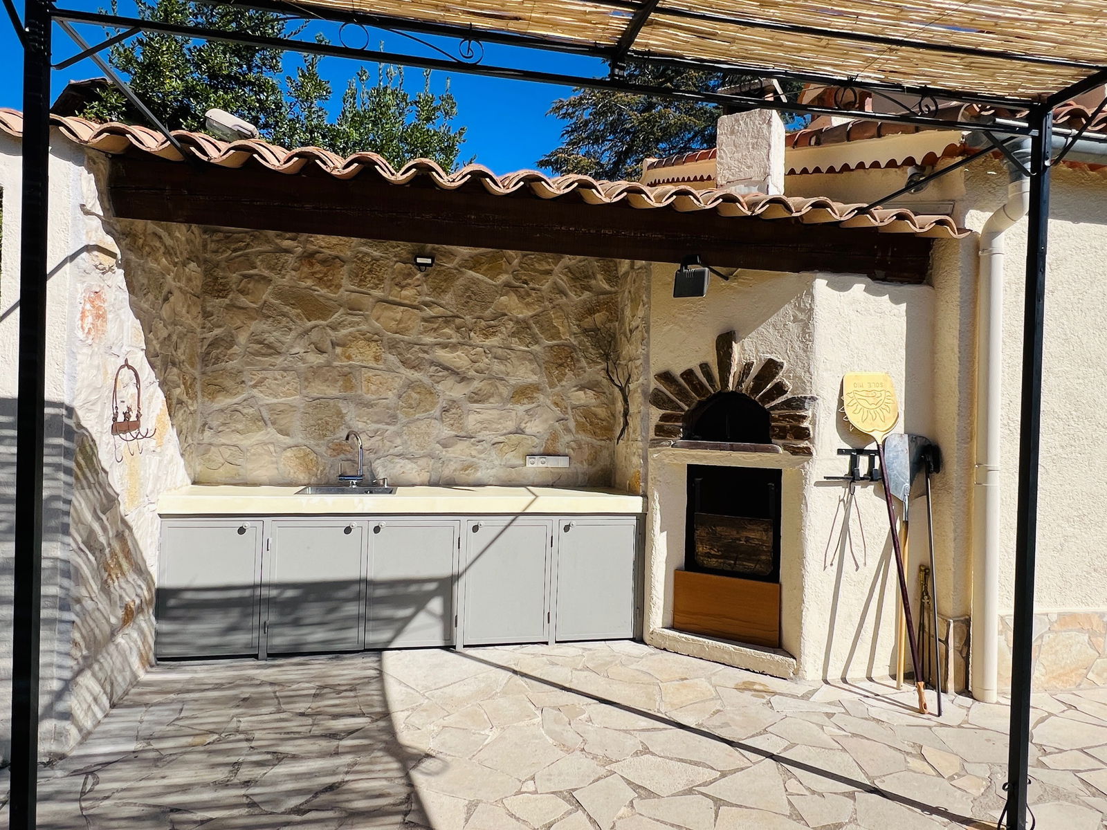 Beknopte omschrijving: u treft in deze luxe villa een grote woonkamer met open haard, een nieuwe luxe woonkeuken met alle apparatuur en volledige uitrusting, vier slaapkamers waarvan een op de begane grond, twee luxe badkamers waarvan een op de begane grond, twee moderne separate toiletruimten, een veranda, een zomerkeuken, meerdere zonneterrassen, een petanque baan en drie restanques.