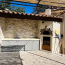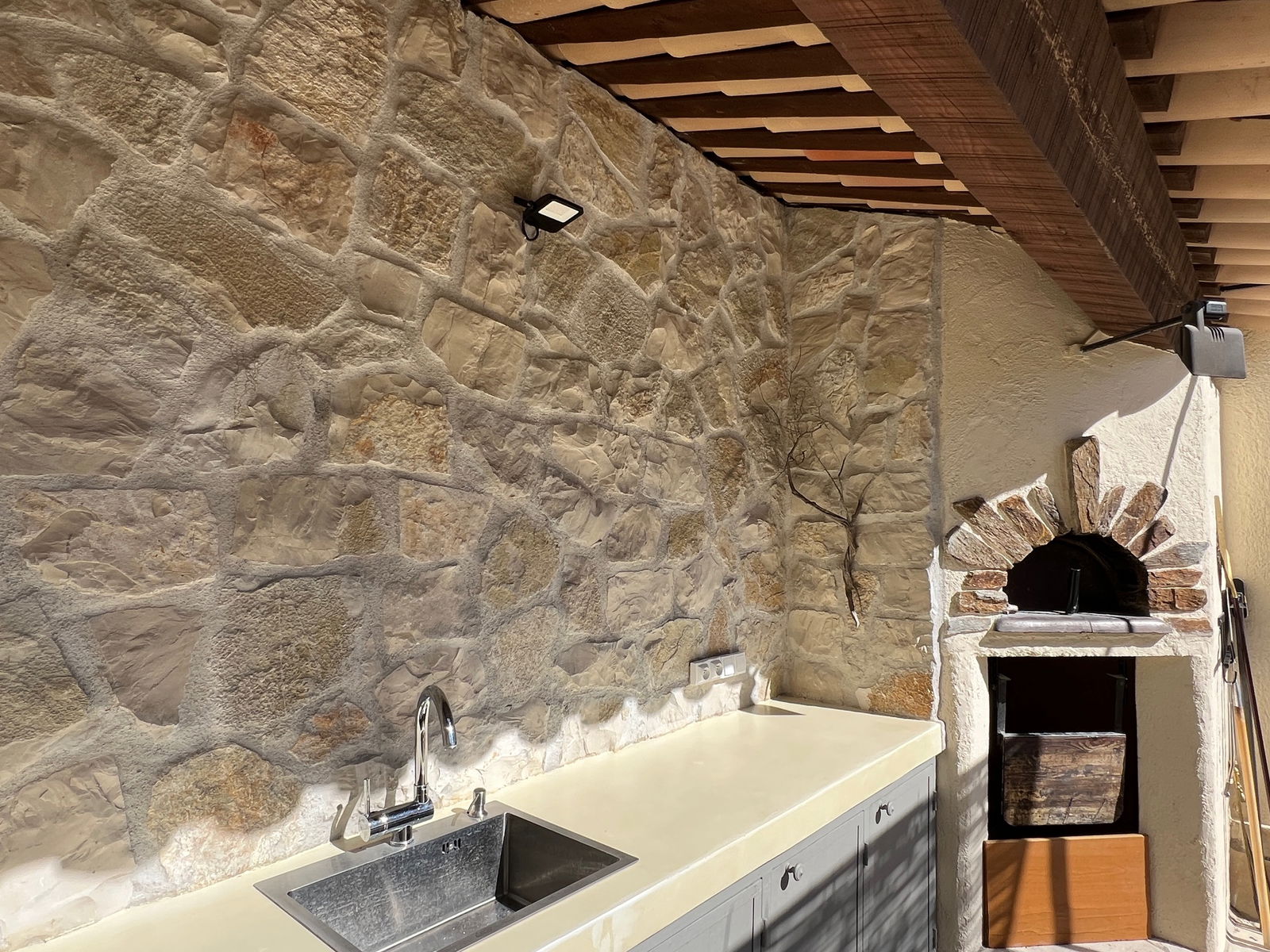 Dit terras ligt evenals de tuin pal zuid, maar mocht u overdag een schaduwplek zoeken dan kunt u hier heerlijk zitten en genieten van de natuur om u heen. Dit terras is uitermate geschikt voor een gezellige uitgebreide lunch met vrienden of familie. Rondom de lange Kloostertafel staan acht stoelen en aan de andere kant van de veranda is nog een separate loungeplek gemaakt voor het gezellige borreluur. Maar ook op het verhoogde “solarium” naast het zwembad en op het terras onder de overkapping grenzend aan de sfeervolle buitenkeuken kunt u heerlijk zitten. De buitenkeuken is voorzien van een aanrecht met spoelbak, kastruimte waarin u o.a. plastic borden en glazen kunt vinden. Wat deze keuken geheel af maakt is de uitstekend werkende hout gestookte Pizza-oven. Hierin maakt u zelf de lekkerste gerechten. Tip: zorg dat de oven goed op temperatuur is voordat u deze gebruikt, zodat de bodem van de oven ook goed heet is en uw pizza een knapperige bodem krijgt 😊. Wij zijn er van overtuigd dat u hier later leuke verhalen over kunt vertellen en er mooie herinneringen aan zult overhouden!