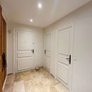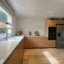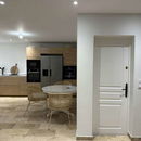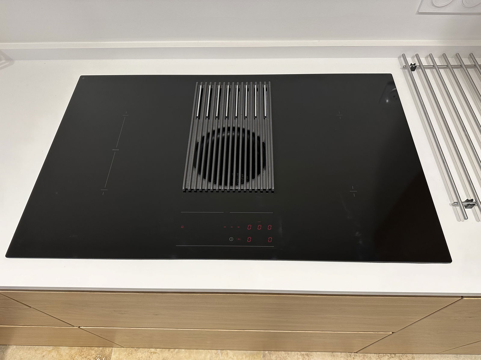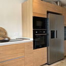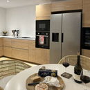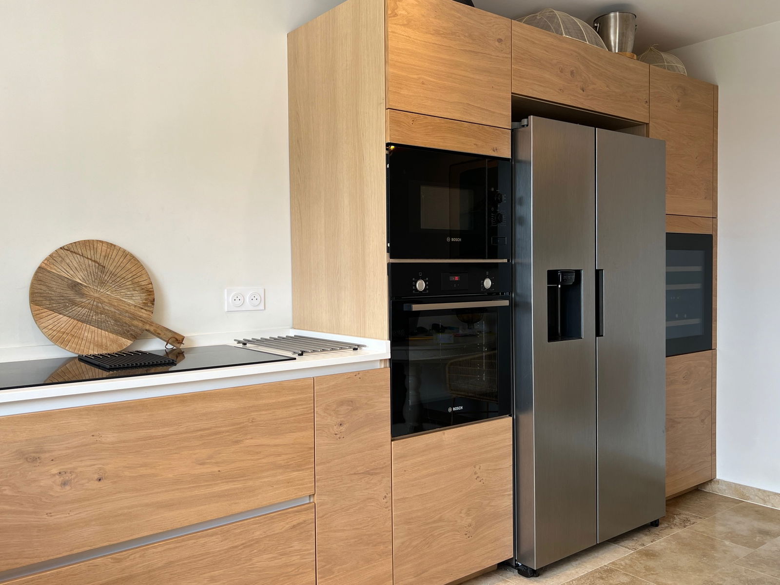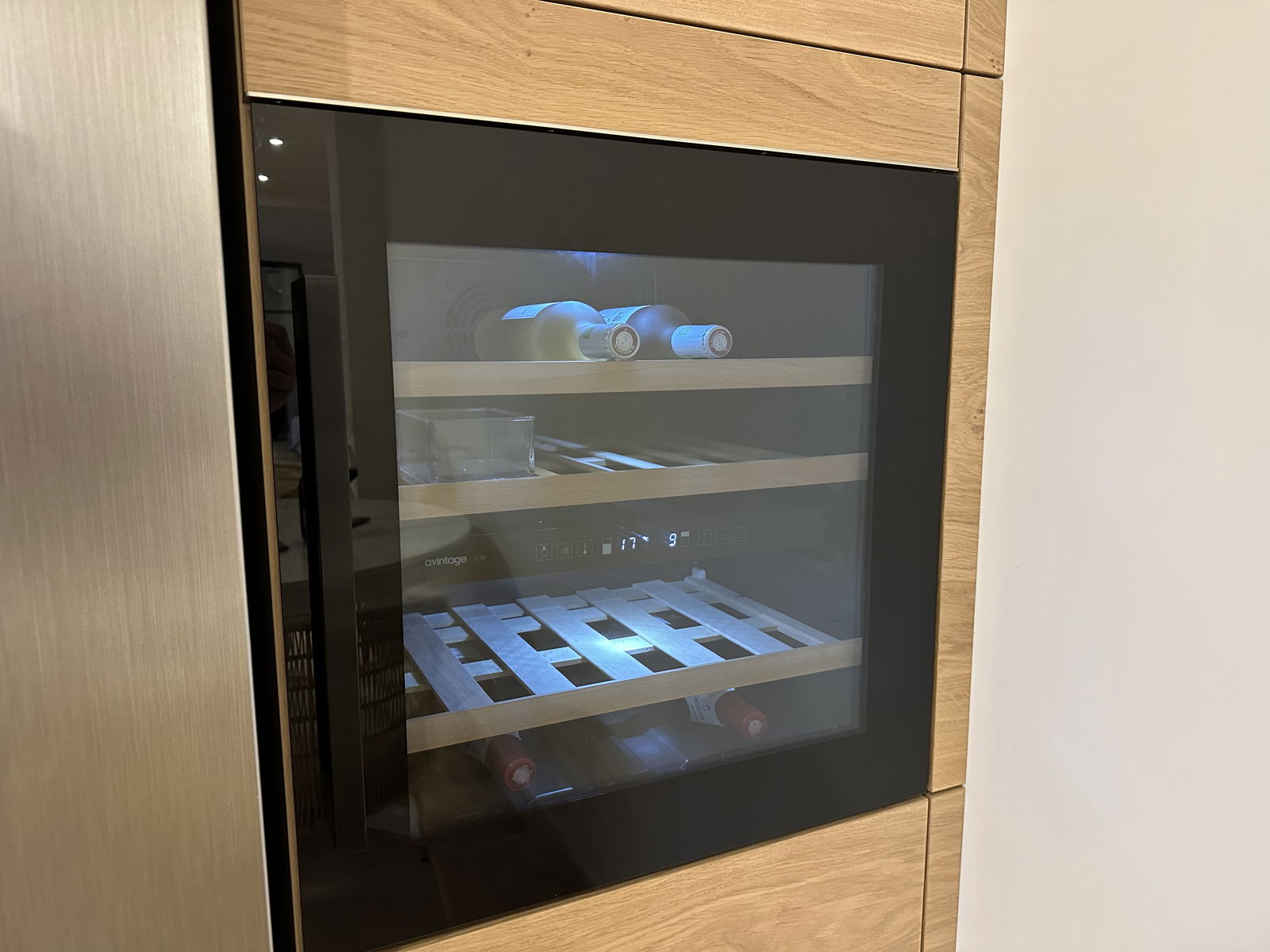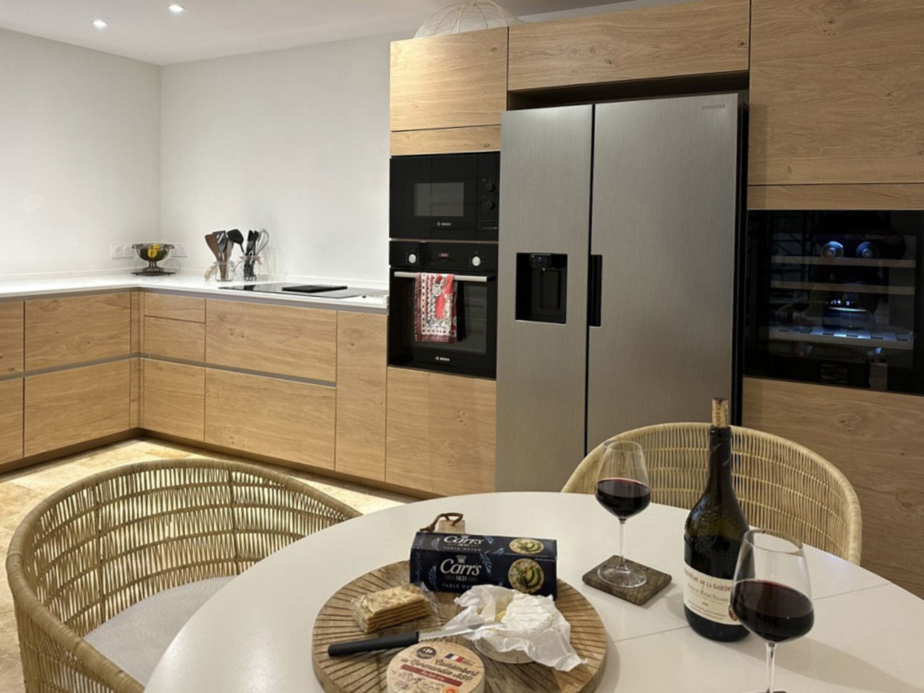Aan de rechterzijde treft u de grote luxe woonkeuken. Deze is nieuw geplaatst in 2024 en voorzien van alle inbouwapparatuur, waaronder een brede inductiekookplaat met geïntegreerde afzuigkap, vaatwasser, wijnklimaatkast met zones voor witte wijn/rosé en rode wijn, een magnetron, een oven o.a. met hete lucht, een grote Amerikaanse ijskast en grote vriezer met ijsmachine. Er is veel kastruimte, waarin u de volledige keukenuitrusting vindt waar u gebruik van kunt maken.