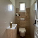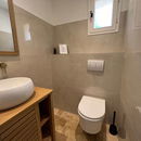 Aan de andere zijde van de gang vindt u een tweede moderne en ruime toiletruime met zwevend toilet en wastafelmeubel met kastruimte.
