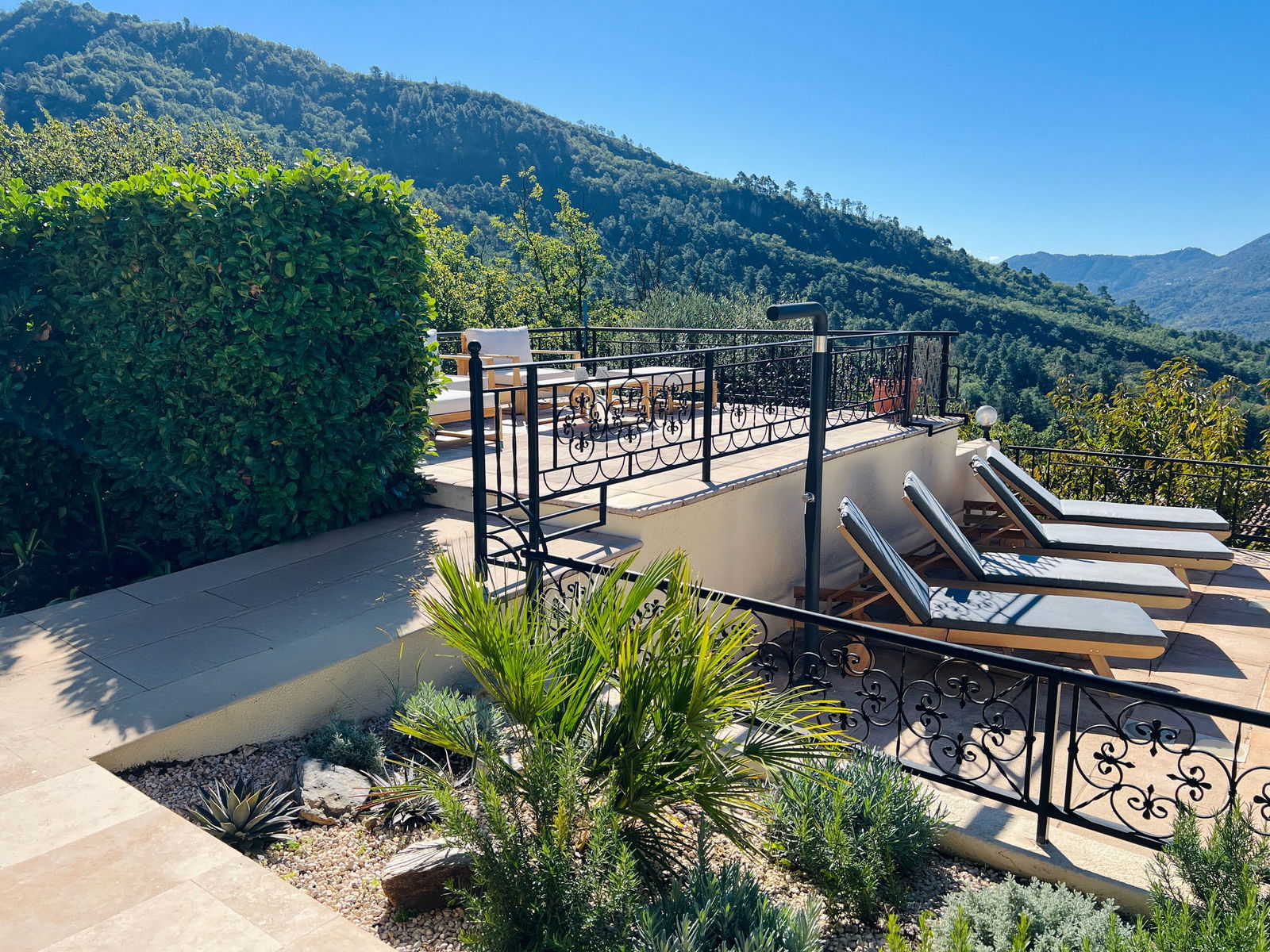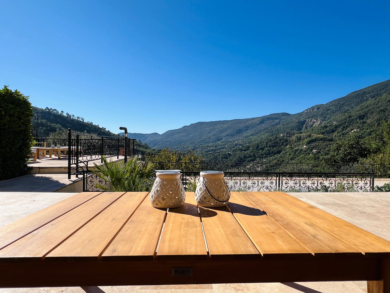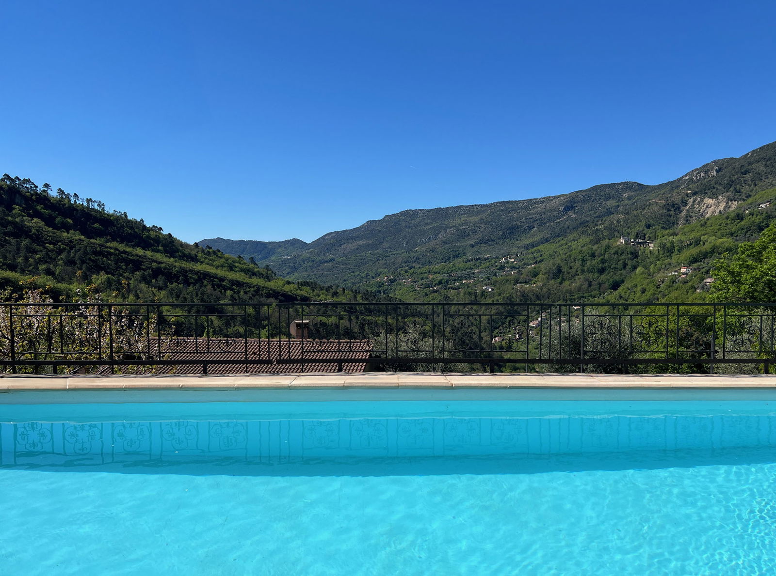 In 2024 geheel gemoderniseerde vrijstaande villa met een groot privé zwembad van ca. 11.00x5.00 met volledige privacy en met een magnifiek ver en vrij uitzicht over het lengtedal tot aan Contes / Nice. Pal op het zuiden gesitueerd waardoor u de hele dag van de zon kunt genieten. Gelegen op een groot perceel grond van 1.540 m2 dat geheel omheind is. Aan het einde van een eigen weg zonder doorgaand verkeer. Beschikbaar woonoppervlak 150 m2. Overdekt terras / buitenkamer 30 m2, samen ca. 180 m2.
